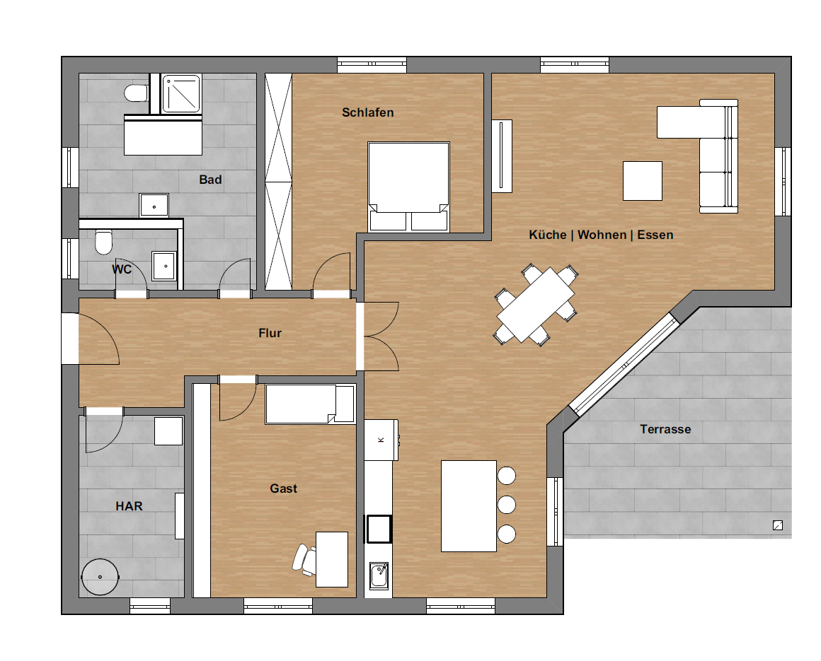Der ebenerdige Grundriss ermöglicht kurze Wege, hohe Alltagstauglichkeit und ein besonderes Gefühl von Freiheit im eigenen Zuhause. Dieser Bungalow vereint Design, Komfort und Funktionalität – perfekt für alle, die entspannt und zukunftssicher wohnen möchten.